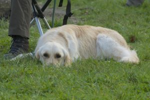 Also musste ich ihn mit einigen „Festhalten“-Kommandos über die Böschung und dann zu mir locken! Ich erwischte zwar das Dummy, ohne dass es runterfiel, aber das Delivery ist zweifellos verbesserungswürdig – noch mal ein unteres „sehr gut“, aber Aufatmen bei mir, Prüfung glücklich beendet, Gratulation von Petra und Entspannung pur während der nächsten Stunde, in der noch die Fortgeschrittenen-Gruppe ihre Prüfung absolvierte.