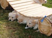 Der erste Freigang am Haus; Bramble hilft mit, dass kein Welpe verloren geht